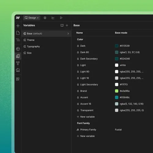 Start by customizing global colors, fonts, theming and font sizing using variables. This ensures all styles update site-wide, keeping your design consistent with minimal effort. To do this, access the variables in the menu on the left. Work through the different variables, updating everything needed to match your brand.